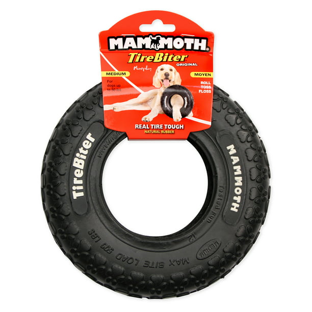 Mammoth tire biter rubber tire dog toy, medium, 8 inches. Show your beloved pet how much you care with this Mammoth tire biter dog toy. It is made with patented two-ply nylon materials. This tire dog toy is suitable for interactive playing. Use it for tossing in the backyard or the park. This rubber dog toy is fun for some tug-of-war. The fibers in the rope make it convenient for cleaning the teeth of your canine companion.