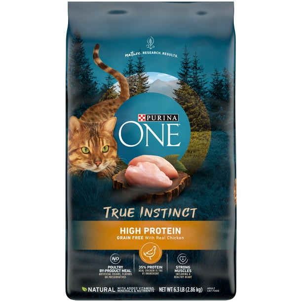 Purina One True Instinct Chicken, Grain-Free, Be sure your cat gets the natural nutrition her body craves when you feed her Purina ONE True Instinct Grain Free With Real Chicken natural adult dry cat food with added vitamins, minerals and nutrients. With 100 percent nutrition and 0 percent fillers, every ingredient has a purpose. The premium grain free cat food starts with real chicken as the #1 ingredient and provides 35 percent protein to help promote her strong muscles, including her healthy heart. Crunchy bites and tender, meaty morsels provide textural variety like cats get in nature. Plus, the crunchy cat kibble, along with added calcium, helps support her strong teeth and healthy gums.